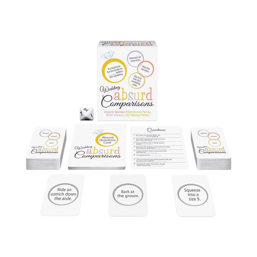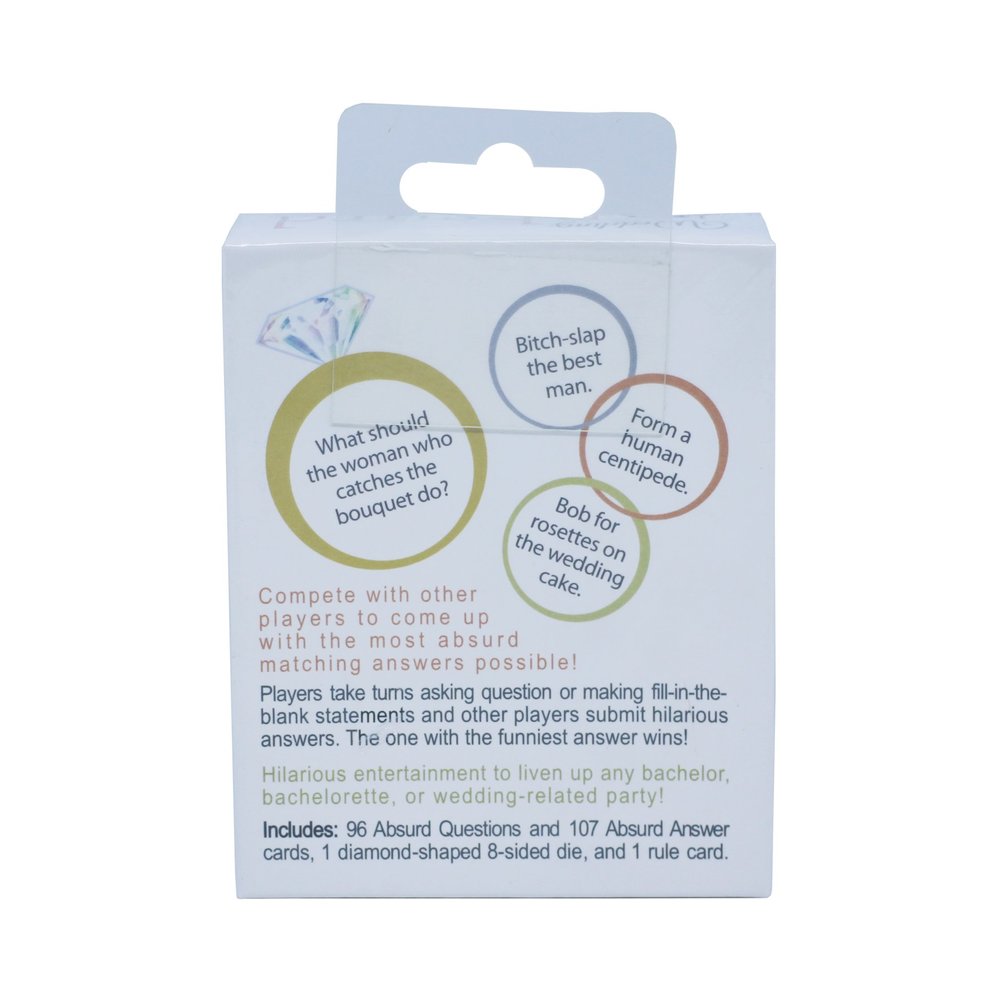 Compete with other players to come up with the most absurd matching answers possible! Players take turns asking question or making fill-in-the-blank statements and other players submit hilarious answers. The one with the funniest answer wins. Hilarious entertainment to liven up any bachelor, bachelorette, or wedding-related party! Includes: 96 Absurd Questions and 107 Absurd Answer cards, 1 diamond-shaped 8-sided die, and 1 rule card.