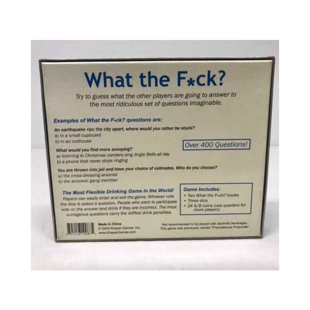 What The F*ck? Try to guess what other players are going to answer to the most ridiculous set of questions imaginable. If you do not correctly predict a player's response, you take a one-, two- or three-drink penalty. The game includes over 400 questions. It is the most flexible drinking game in the world! Players can easily enter and exit the game and you can play with anywhere from 2 to over 100 players.