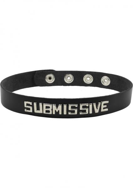 Make a statement without saying a word with this sassy leather collar. The comfortably slender band comes with four adjustment snaps to ensure a snug fit, and features a sassy saying in silvertone letter studs along the front. Perfect for a night at the club or a hot and heavy BDSM scene in the bedroom, this naughty collar will ensure all eyes are on you! Color: Black Material: Leather Reads: Submissive Closure: Snaps Special Features: Adjustable