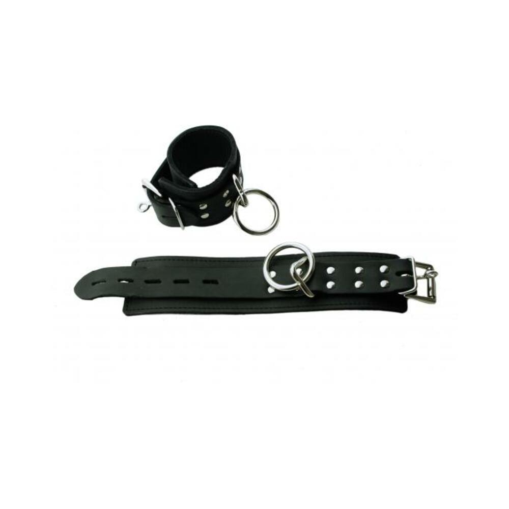 Classic Black Leather Restraints lined with plush Faux Fur that makes them soft and cushion-like. Single front D-ring is attached for optional leash/chain. Wrist restraints adjust from 4' to 7". All restraints are 2" wide. Handmade in USA by Spartacus Leather craftsmen.