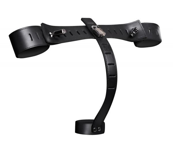 Keep your sub secure and helpless with this intense bondage and CBT device. Comprised of 4 adjustable leather straps, this set is designed to connect the wrists of your subject to their genitals, via the strap up the back. This set requires 4 locks to close (not included). Measurements: Cock cuff is adjustable from 7.5 to 9 inches in circumference; Back strap is adjustable from 5.5 to 12.5 inches in length; Wrist cuffs are adjustable fro 6.25 to 9.75 inches in circumference, and between 2.25 and 9 inches apart. Material: Leather, metal. Color: Black. Note: Locks sold separately Warning: This is a NEW item that is not in retail packaging, usually a plain box, wrapped in plastic or a poly bag.