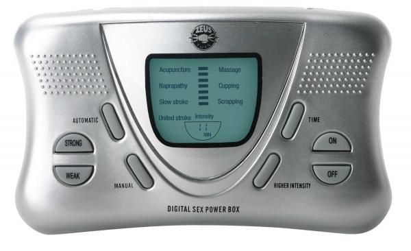 Warning:Current must never flow through the heart. Do not use if you have a pacemaker, are pregnant, if you suffer from epilepsy, or on any broken or inflamed skin.Zeus Electrosex Digital Box power for quality electrosex and e-stim sex toys for beginners or advanced users. The Deluxe Digital Power Box is a great toy for beginners. It features two channels with adjustable intensity, seven preset routines, a timer, and a digital display. It has plenty of power, enough for even the most intense user. The complex preset routines really make it stand out, as they offer very unique sensations. It comes with two snap clip leads and four extra large adhesive pads. It's also compatible with any of our bipolar accessories. Just pop them out of the box and hook them up for new and exciting sensations. Digital Power Box Set Includes: Digital power box, 4 premium adhesive pads, sets of 2, 2 lead wires. Power box requires 3 AAA batteries, not included. Manual included. Safety: Electrosex is a sexual activity that requires caution. As a rule of thumb we highly recommend keeping electrosex play below the waist. In addition please do not use our products if any of the following apply to you: have a pace maker. Have epilepsy or other neurological disease. Are pregnant. Have heart disease. While driving or operating equipment. Near any metal objects such as piercing jewelry, rings, bracelets or metallic IUDs. Electrify your sex life.Compatibility:: This unit works with all Zeus Electrosex accessories. We advise you not to use e-stim devices above the waist as dictated in most electro sex guides. People with heart conditions should not use this product.