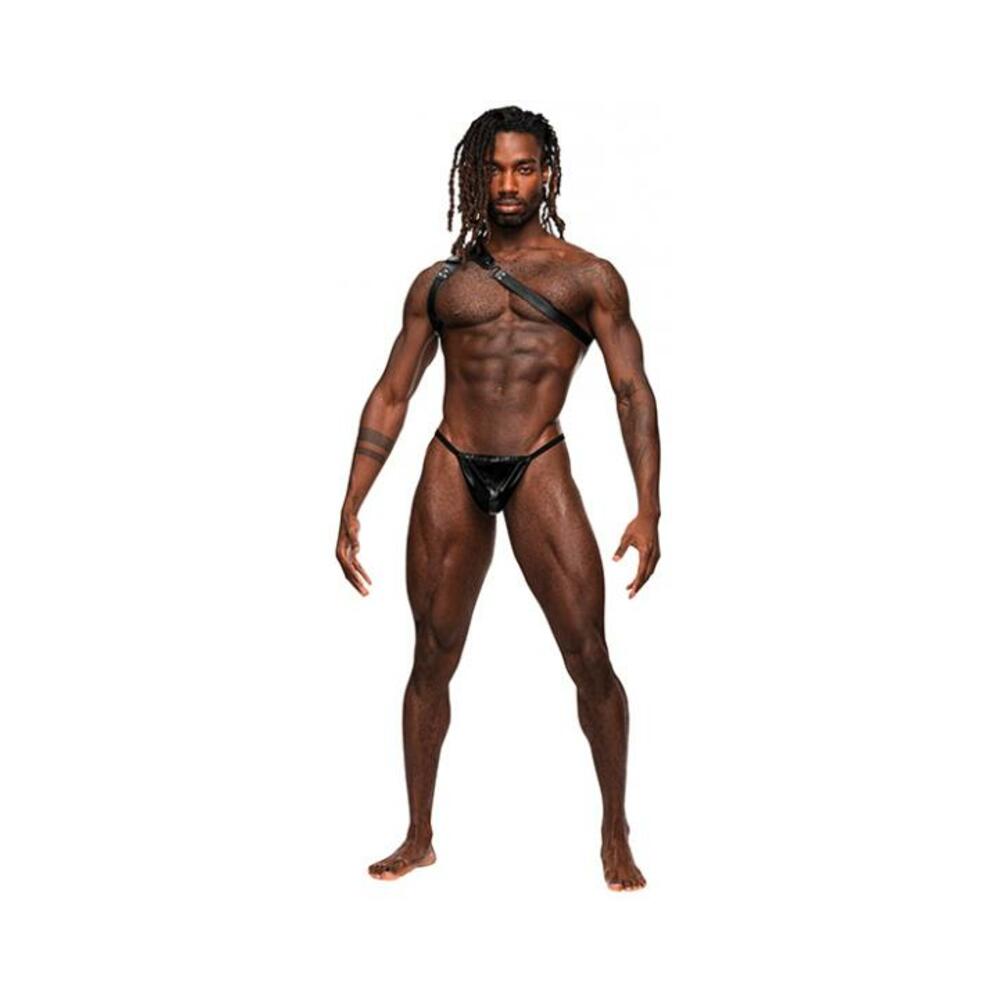 From the Leather collection by Male Power, this style includes a one shoulder harness with adjustable strapping, metal buckles, rings and studs. Soft Nubuck Leather with Polyurethane coating, heavy metal rings, buckles, and studding. Fabric: Polyurethane coated split leather. Care Instructions: Do Not Wash, Do Not Bleach, Do Not Tumble Dry. One Size.